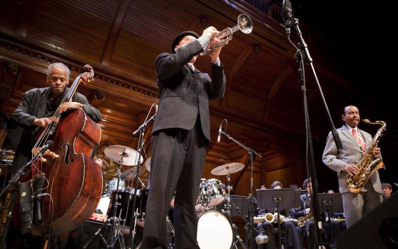 Ivy League universities are known for bringing together extraordinary individuals to do extraordinary things. Yet Saturday, April 9 was an even more extraordinary night at school for Harvard students, when an honor roll of jazz talent joined them to celebrate "40 Years of Jazz at Harvard." The concert capped off a weekend of events, including the opening of an exhibition of original manuscripts and memorabilia, and a discussion about the history of jazz at Harvard with Quincy Jones Professor of African American Music Ingrid Monson and Tom Everett, the driving force behind Harvard's jazz programs.