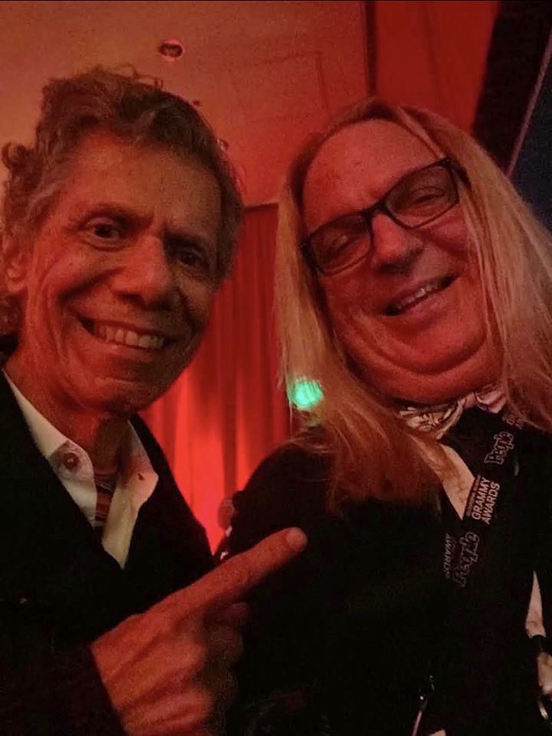 Courtesy Lona Dion Return to Forever founder Chick Corea executes the classic Horace Silver single point towards fellow pianist Mike Bogle at the 2020 Grammy Awards After Party.