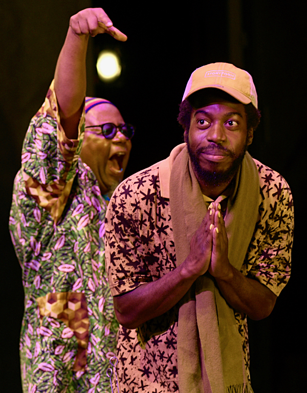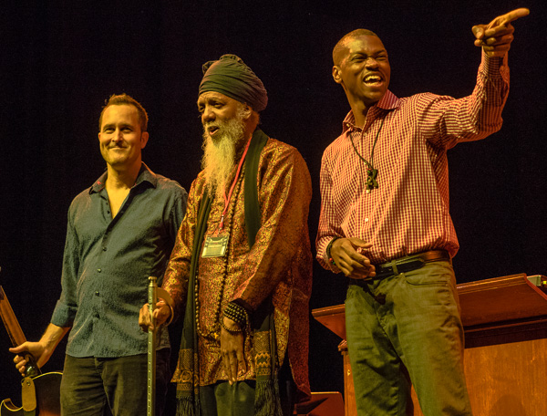 ![]() Mekala Session, leader of the Pan African People's Arkestra, receives an enthusiastic point down from Dwight Trible. | ![]() Percussionist Munyungo Jackson pointing out Derf Reklaw's quality lid. |