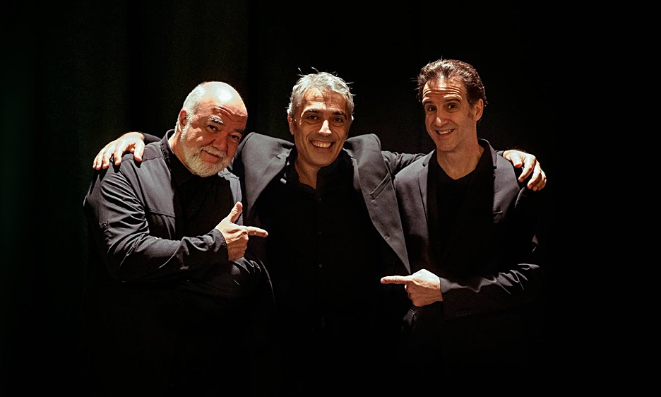 Jazz musicians pointing at one another