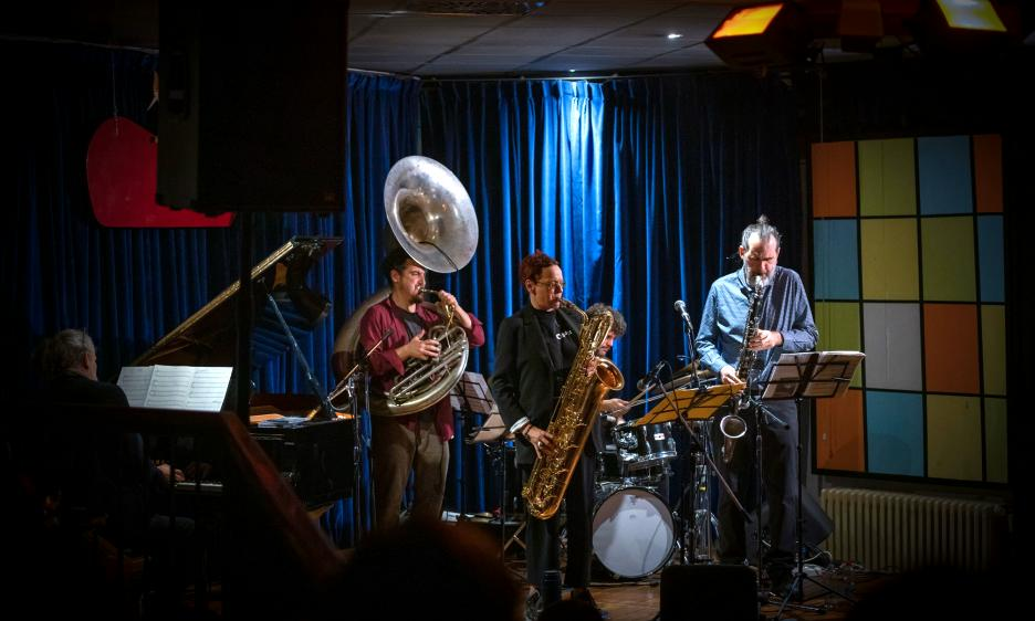 Da questo punto di vista, il concerto ha tratto indubbio valore dalla bellezza del suono del baritono della Plankensteiner (che occasionalmente ha anche cantato, perlopiù attraverso un megafono) e del clarinetto basso di Succi, tutto sommato i principali protagonisti i due hanno anche duettato vocalmente nelle pause, presentando i brani con simpatica ironia che tuttavia non hanno oscurato né la tuba di Benedetti molto presente e che s'è tutt'altro che limitato a un lavoro ritmico né la batteria di Soldàanch'egli molto attivo nel pennellare colori sulle trame della formazione. Discorso a parte per Lösch, apparentemente dedito soprattutto a legare le varie voci, ma di fatto pronto ora a gettarsi nel blues sempre presente, ora ad ampliare le pause con passaggi obliqui e astratti.
