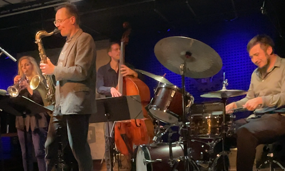 The following night, it was Charlottenberg instead, for a visit to Berlin's key jazz club, the A-Trane, which is way smaller than Schlot, but often features some of the starriest names on the international scene. It's also on street-level, rather than down steps. Tables but no food, although they always offer dark beer-brew on tap, unlike most Berlin jazz haunts. The second set of bassist Lisa Wulff's Poison Ivy quartet probably caught them in a more climactic state than the first. Wulff comes from Hamburg, and won the German Jazz Prize for bass in 2023. Poison Ivy also includes Adrian Hanack (tenor saxophone), Frank Chastenier (piano) and Silvan Strauss (drums).