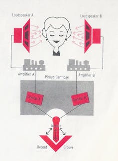 A graphic detail, from an RCA inner sleeve, shows listeners how new stereo technology operates. (From the collection of Janet Borgerson and Jonathan Schroeder, Author provided)