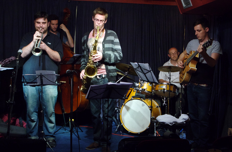 L-R: Paul Jordanous, Max Luthert, Duncan Eagles, Eric Ford, Leo Appleyard. The Verdict, Brighton, East Sussex, UK. Friday, 12th Sept., 2014. Photo ref: 50047
